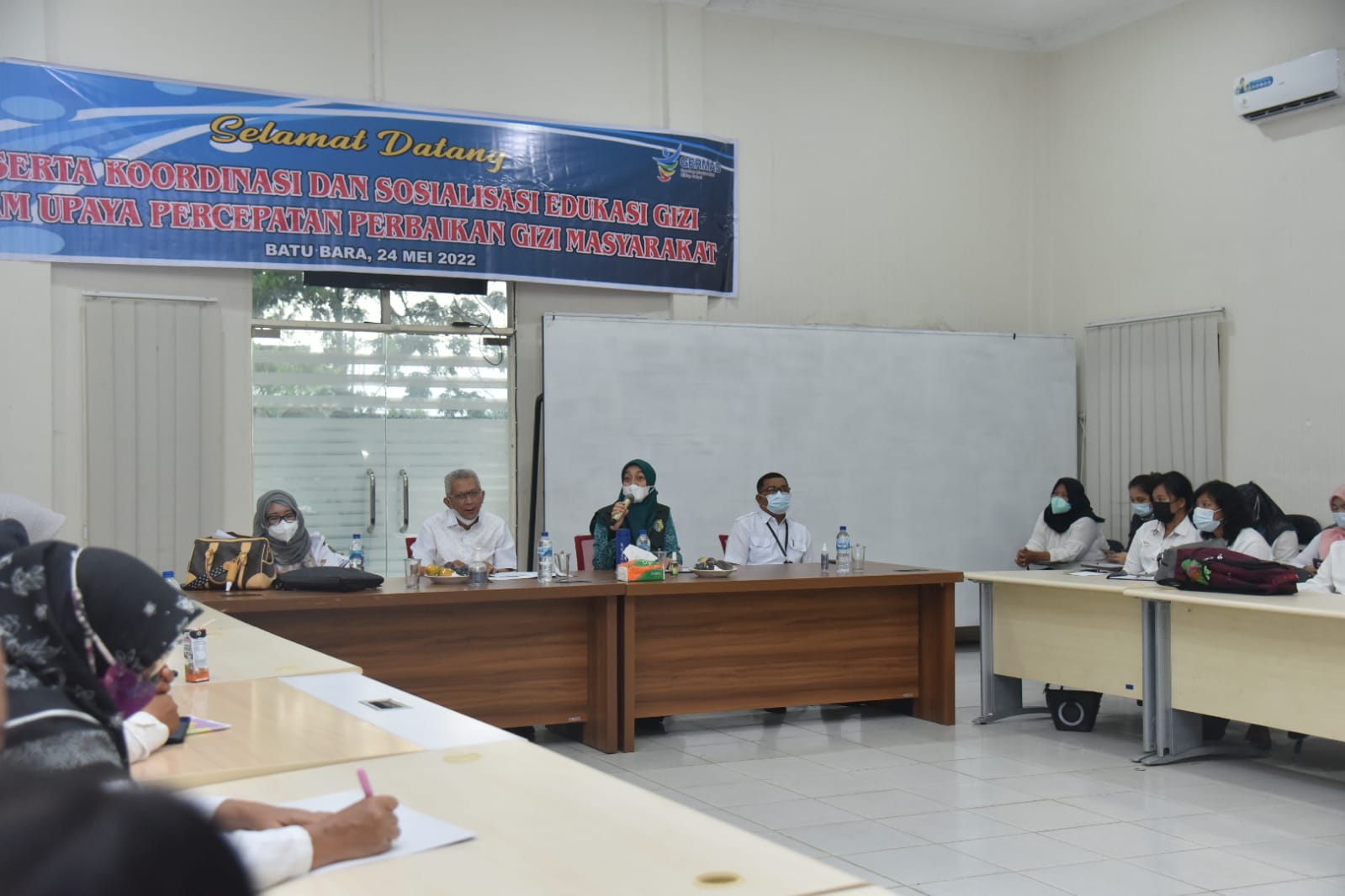 Ketua Tim Penggerak Pemberdayaan Kesejahteraan Keluarga (TP-PKK) Kabupaten Batu Bara, Maya Indriasari Zahir, menghadiri pertemuan koordinasi dan sosialisasi edukasi gizi di Aula Dinas Kesehatan dan Pengendalian Penduduk dan Keluarga Berencana (P2KB) Kabupaten Batu Bara, Kecamatan Lima Puluh, Rabu (25/05/2022).