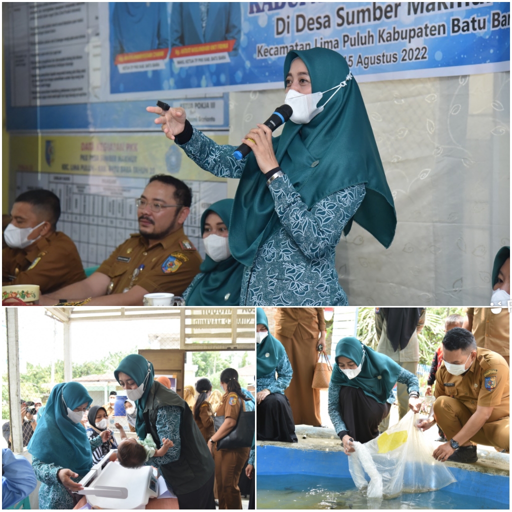 Ketua Tim Penggerak Pemberdayaan Kesejahteran Keluarga (TP-PKK) Kabupaten Batu Bara Ny. Maya Indriasari Zahir, S.E., meninjau pelayanan Posyandu dan memberikan vitamin A kepada balita di Posyandu Pembantu Desa Sumber Makmur, Kecamatan Lima Puluh, Batu Bara, Senin (15/08/2022).